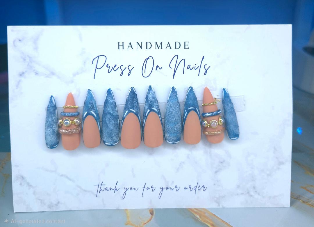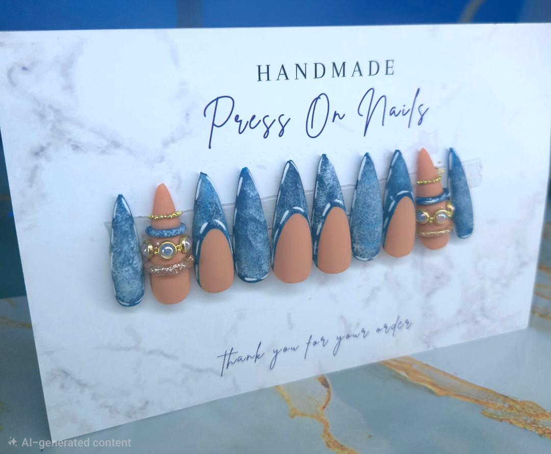 Elevate your nail aesthetic with this striking acid wash jeans-inspired design, expertly crafted on elegant stiletto nails. The matte finish delivers a sophisticated, modern edge while handmade bangles accent the nail art with artisanal charm. Complemented by a classic French manicure base, this design seamlessly blends trendy denim aesthetics with timeless nail elegance. Perfect for those seeking a bold statement that balances contemporary style with refined craftsmanship. All nails are made to order. Please allow 2 weeks to receive your order.