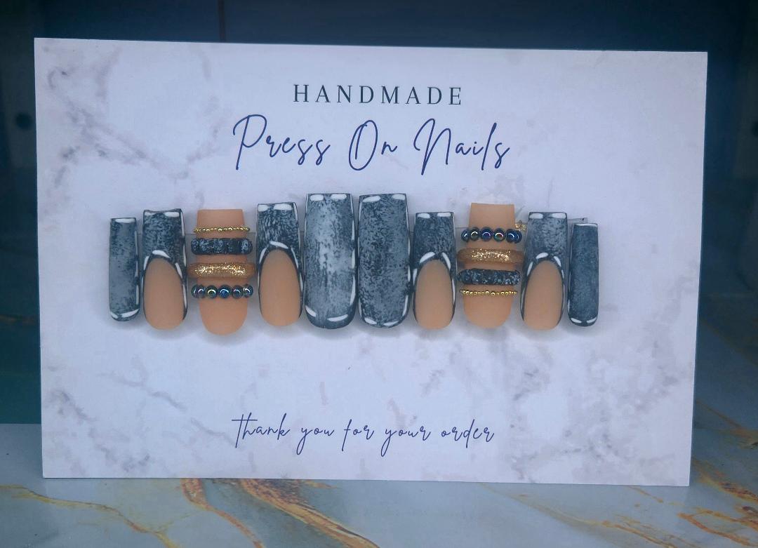 Black Denim press-on nails combine edgy 90's aesthetic with timeless elegance. These long nails feature a sleek black denim design paired with mixed metallic bangles and classic French tips for a sophisticated, trend-forward look. Perfect for those seeking a bold statement that balances retro vibes with modern polish. Effortless application, all-day wear, and instant style transformation. All nails are made to order. Please allow 2 weeks to receive your order.