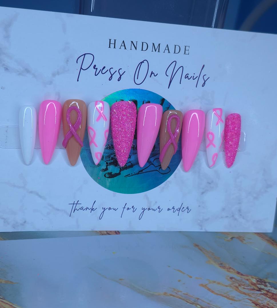 Handcrafted stiletto nails designed to celebrate breast cancer awareness with striking pink and white colorways accented by shimmering glitter details. Each set features an elegant pink ribbon motif, symbolizing hope and support. Perfect for making a meaningful statement while maintaining sophisticated style. These custom press-on nails combine artisanal craftsmanship with purposeful design, allowing you to express solidarity in glamorous fashion. All nails are made to order. Please allow 2 weeks to receive your order.