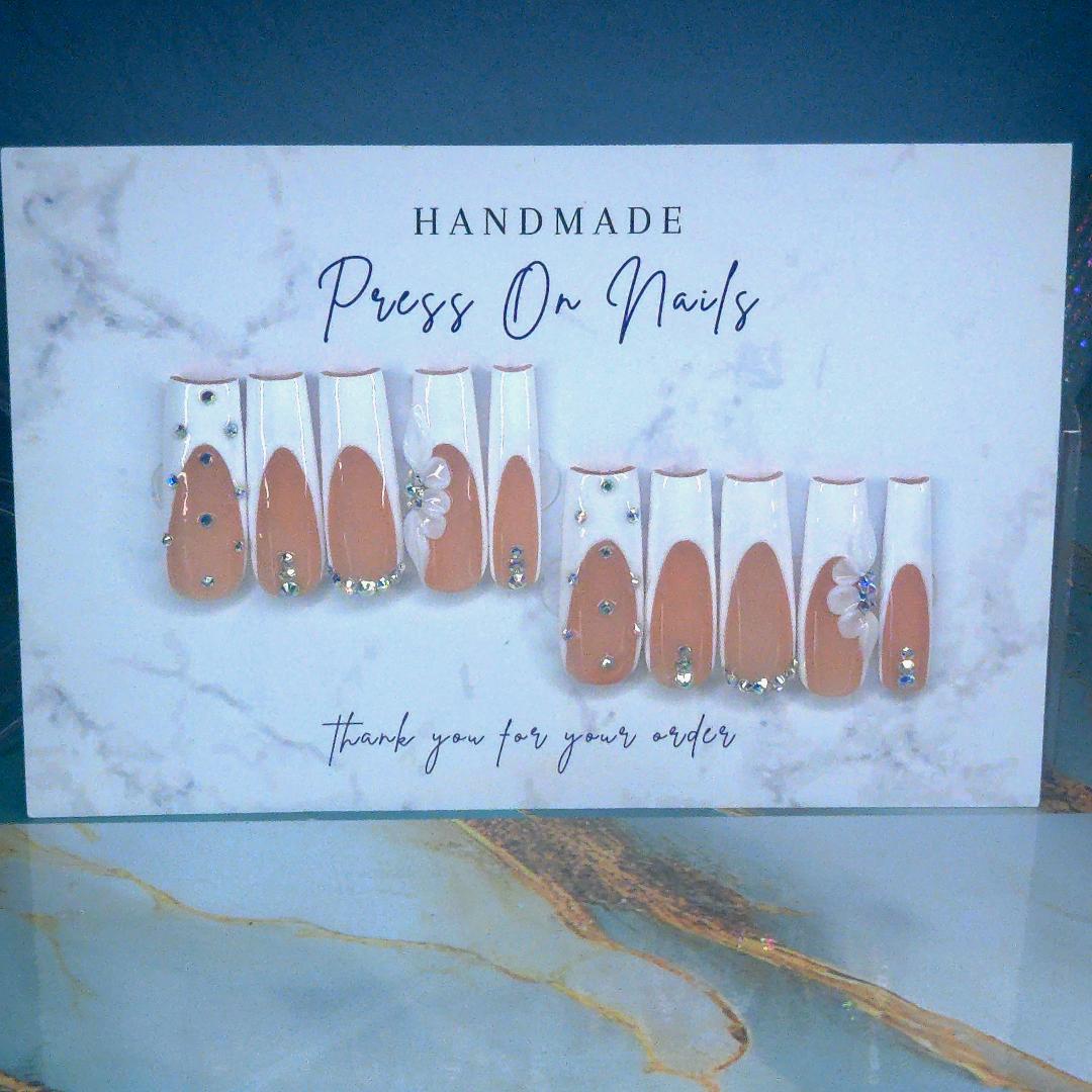 Elevate your bridal look with these handcrafted press-on nails featuring a timeless classic French tip design. Delicate white flowers adorned with sparkling rhinestones create an elegant focal point perfect for weddings and special occasions. Each nail is meticulously hand-applied with premium rhinestones for a luxurious finish that catches the light beautifully. The simple yet sophisticated design complements any bridal aesthetic while maintaining a refined, understated elegance. Professional quality craftsmanship ensures durability and a flawless appearance throughout your celebration. All nails are made to order. Please allow 2 weeks to receive your order.