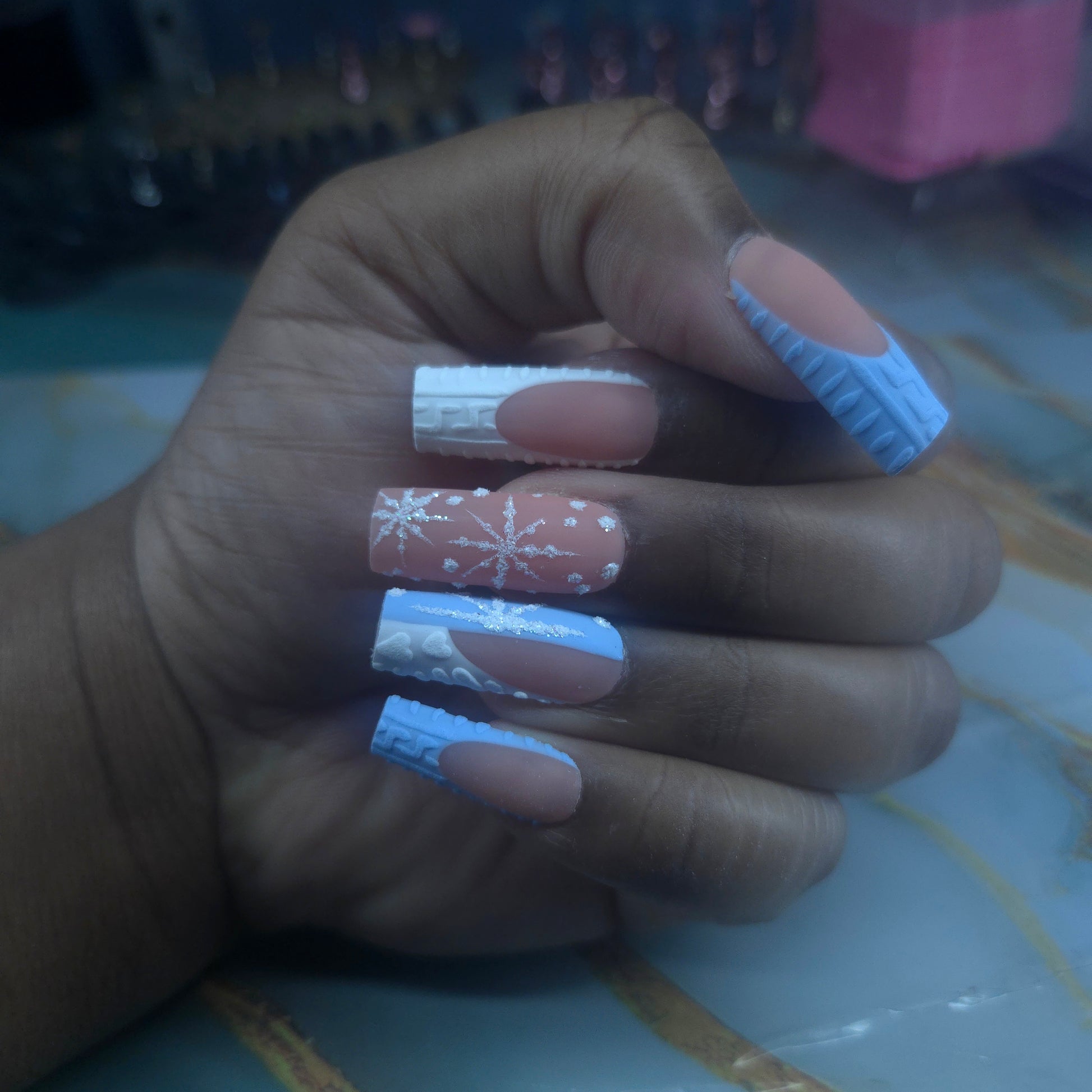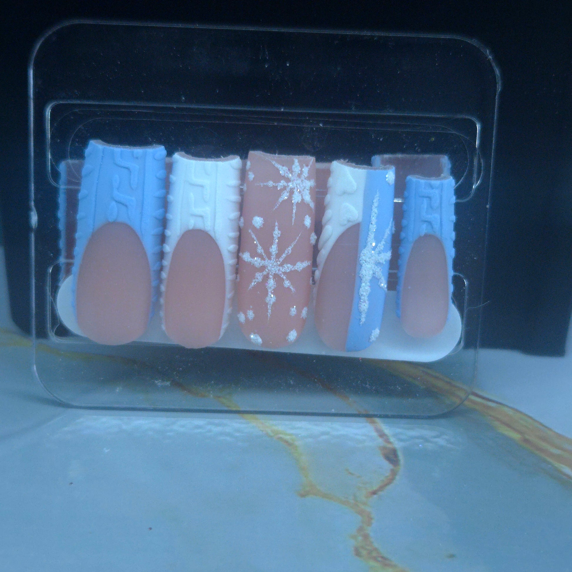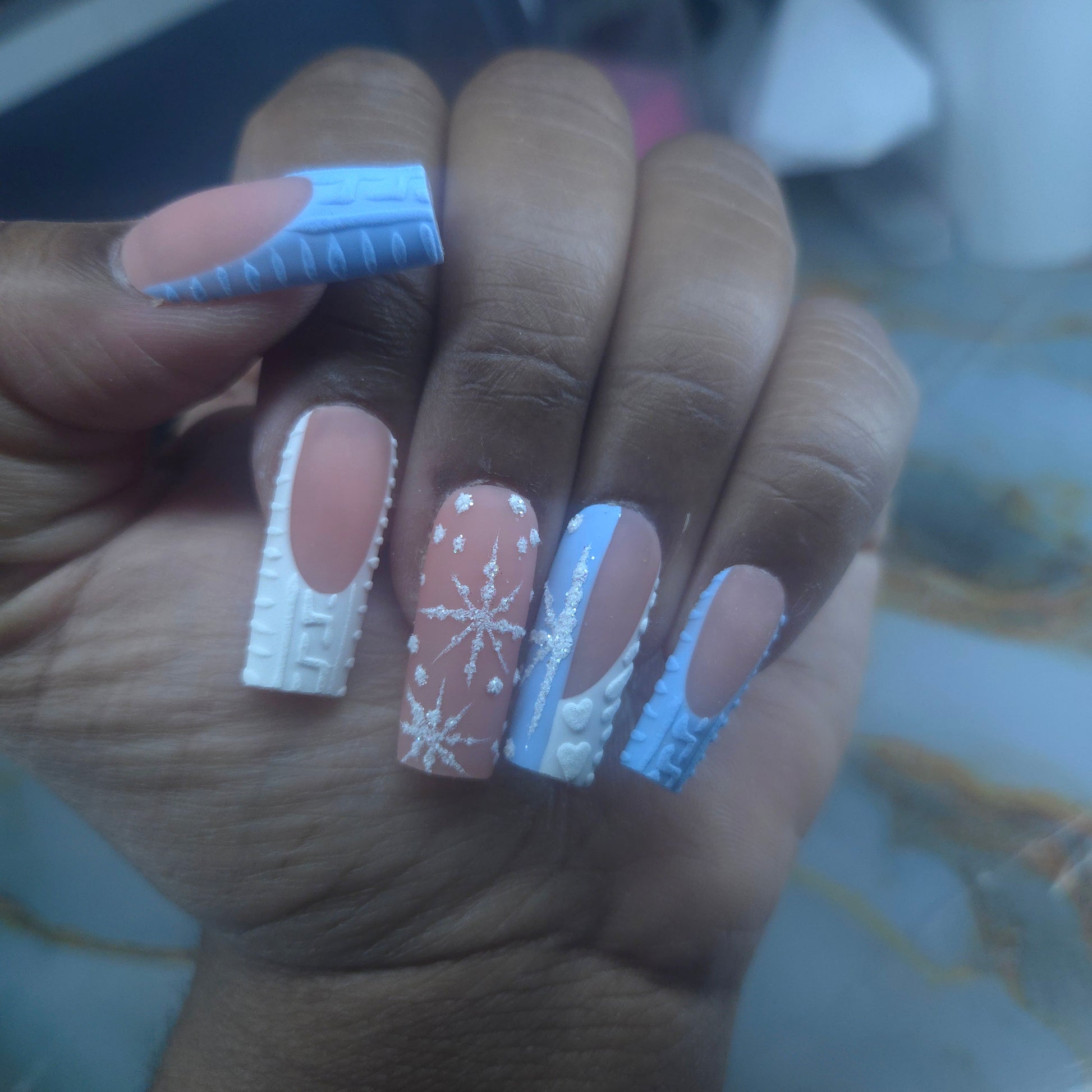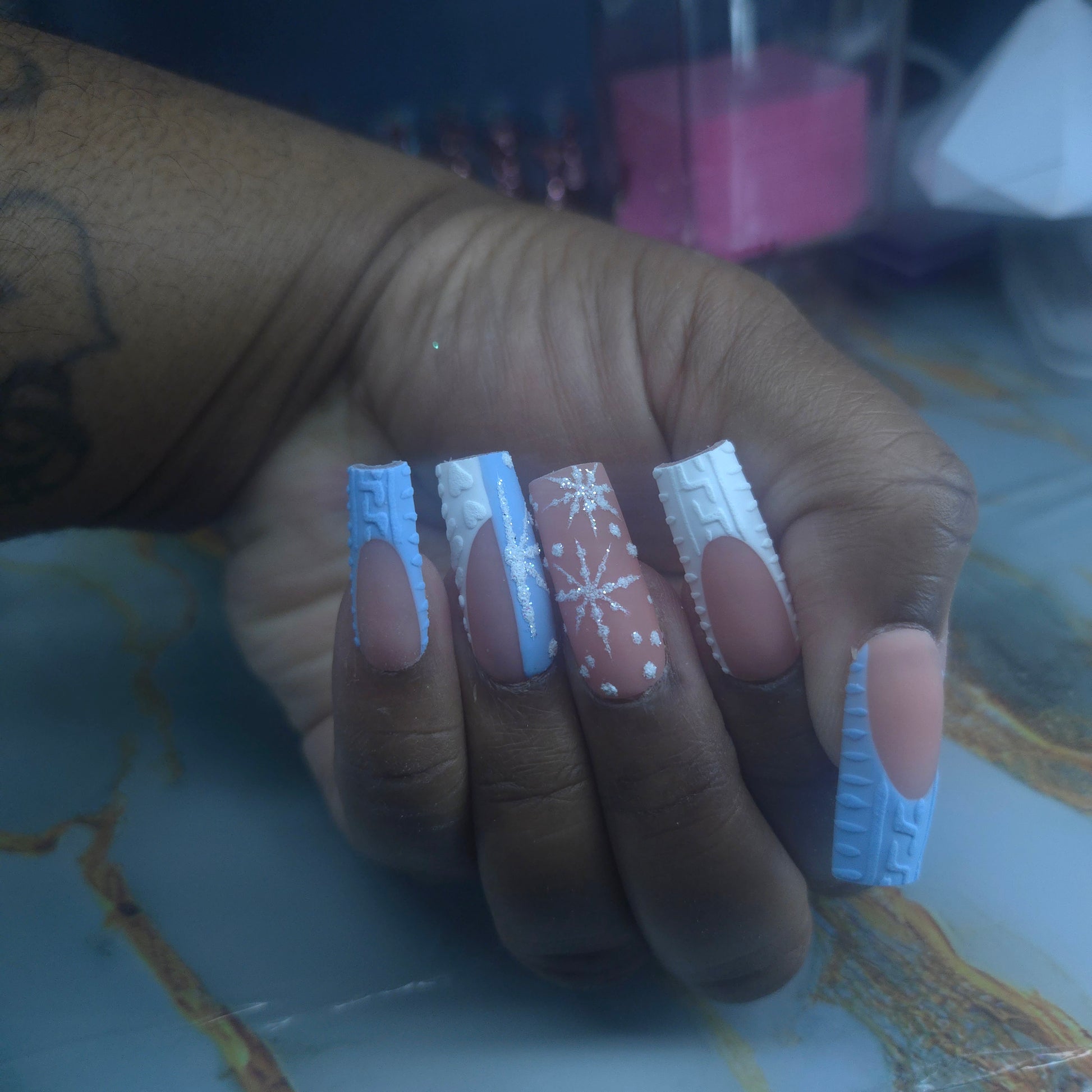 Transform your nails into a winter wonderland with our Cozy Snowflake design. These medium length nails feature white glitter snowflakes on a light blue sweater design, complete with French tips for a sophisticated touch. Bring some warmth and festive charm to your winter look.