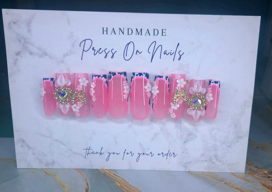 Elevate your nail game with these striking Flashy Cow press-on nails, featuring a bold cow print design paired with delicate flower charms and eye-catching rhinestones. The pink base provides a soft foundation that beautifully contrasts the dramatic print, while the extended length offers a glamorous, statement-making silhouette. Perfect for those who want to showcase their bold style with sophistication and flair. All nails are made to order. Please allow 2 weeks to receive your order.