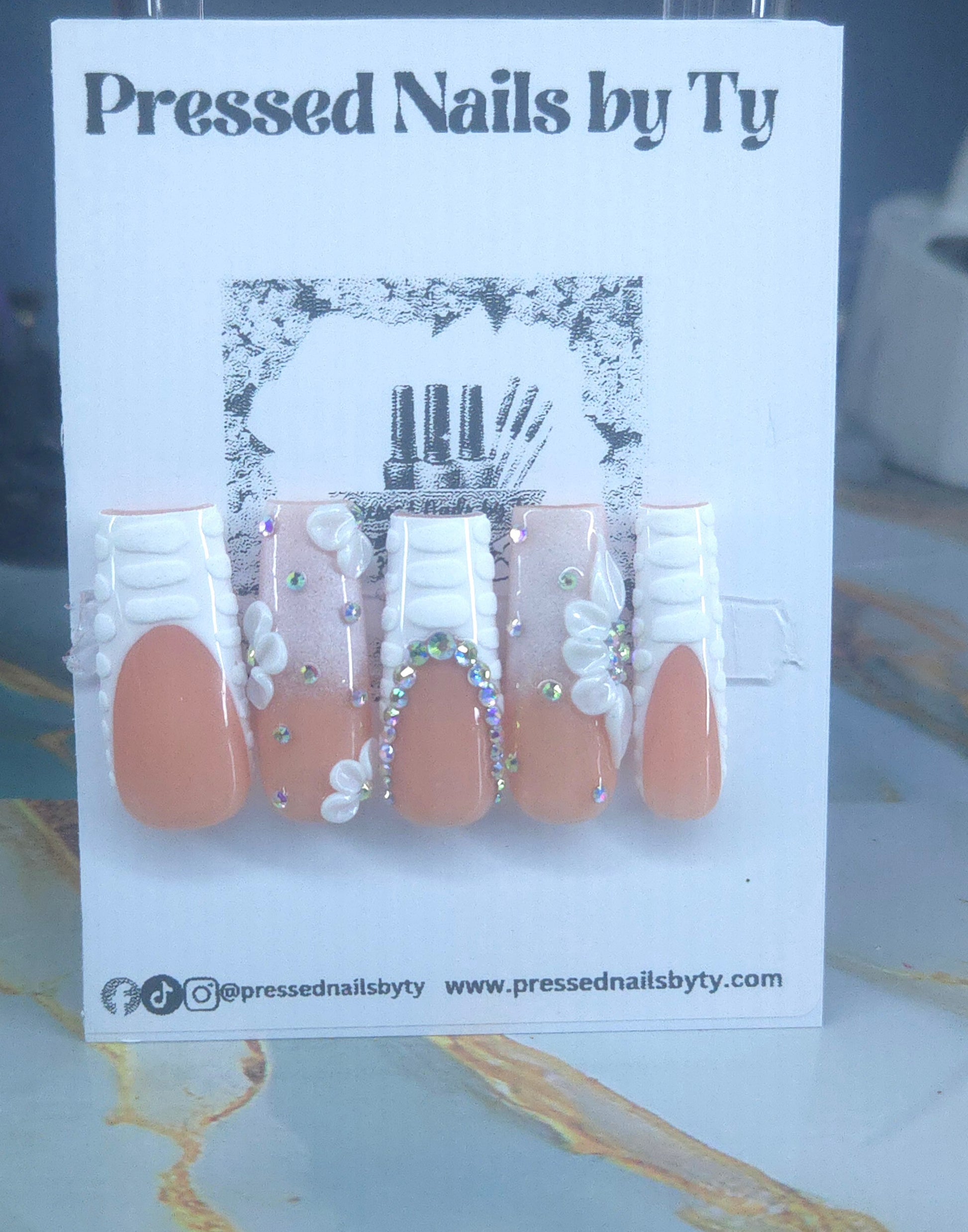 Elevate your nail aesthetic with these meticulously crafted French tip press-ons featuring a sophisticated crocodile texture design. Each nail showcases an elegant ombre gradient transitioning from soft white to deeper tones, complemented by delicate handmade floral accents and sparkling rhinestone embellishments. Expertly constructed for a seamless application, these artisanal nails deliver salon-quality results with distinctive character. Perfect for those seeking refined elegance with artistic flair. All nails are made to order. Please allow 2 weeks to receive your order.