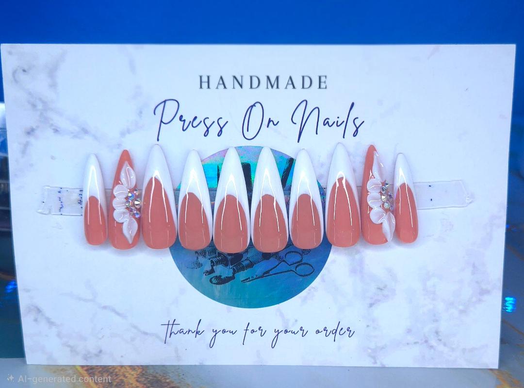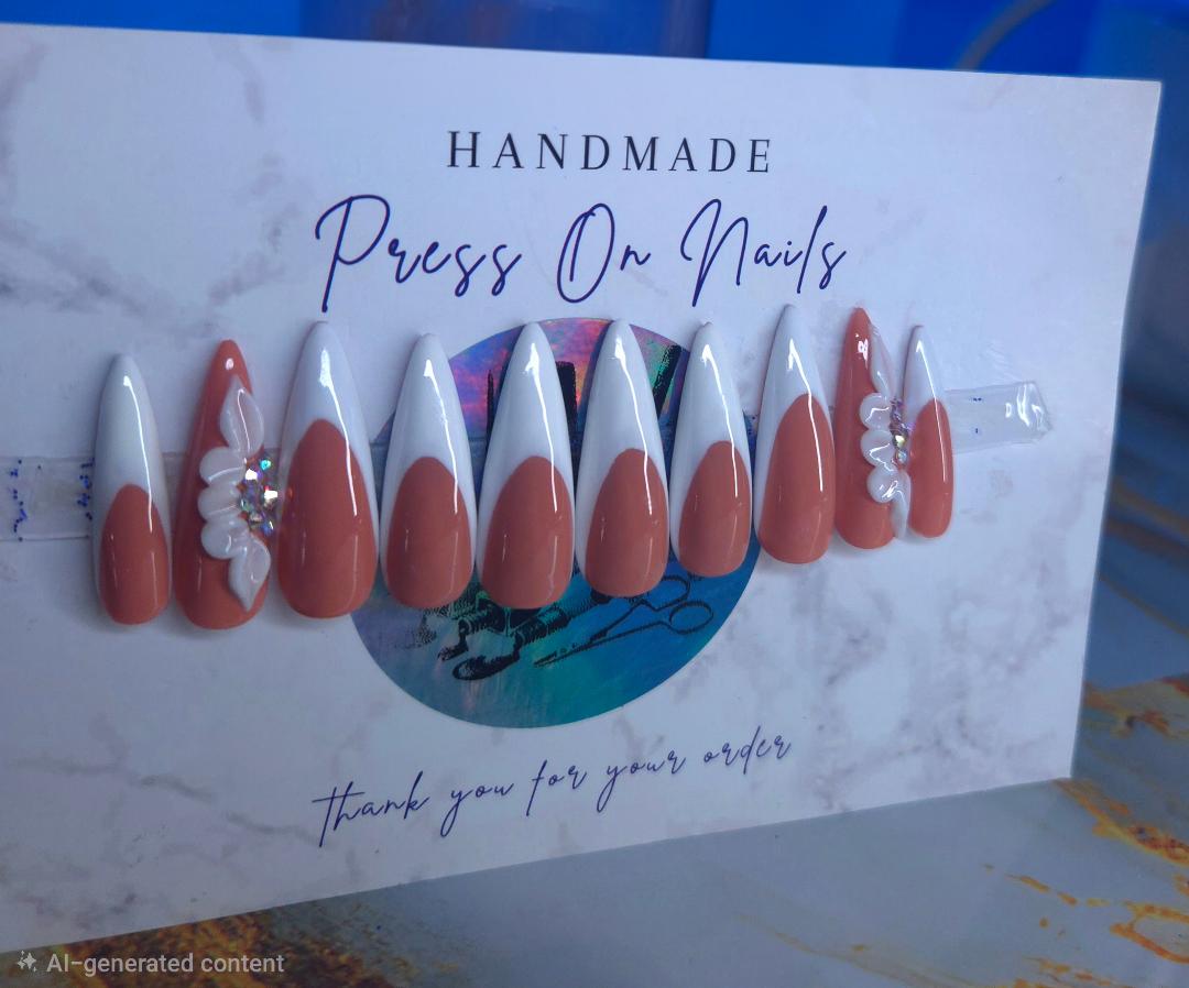 Elevate your nail aesthetic with these handcrafted stiletto nails featuring a timeless French tip design adorned with delicate flower embellishments and sparkling rhinestones. Each set is meticulously created to deliver a sophisticated, salon-quality finish that commands attention. The elongated stiletto shape provides a bold, elegant silhouette, while the intricate floral details and crystal accents add dimension and luxury. Perfect for special occasions or everyday glamour, these nails offer a refined statement piece that showcases artisanal craftsmanship and attention to detail. All nails are made to order. Please allow 2 weeks to receive your order.
