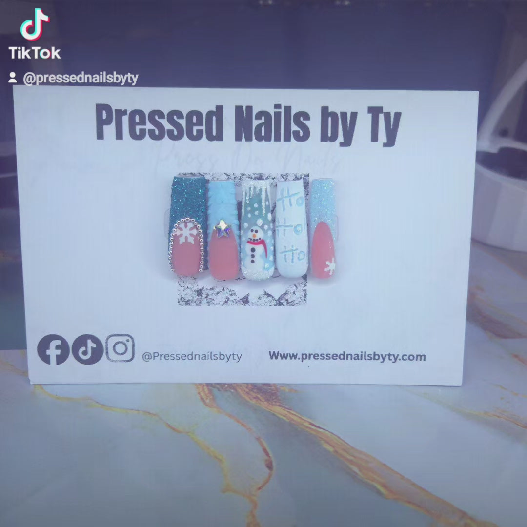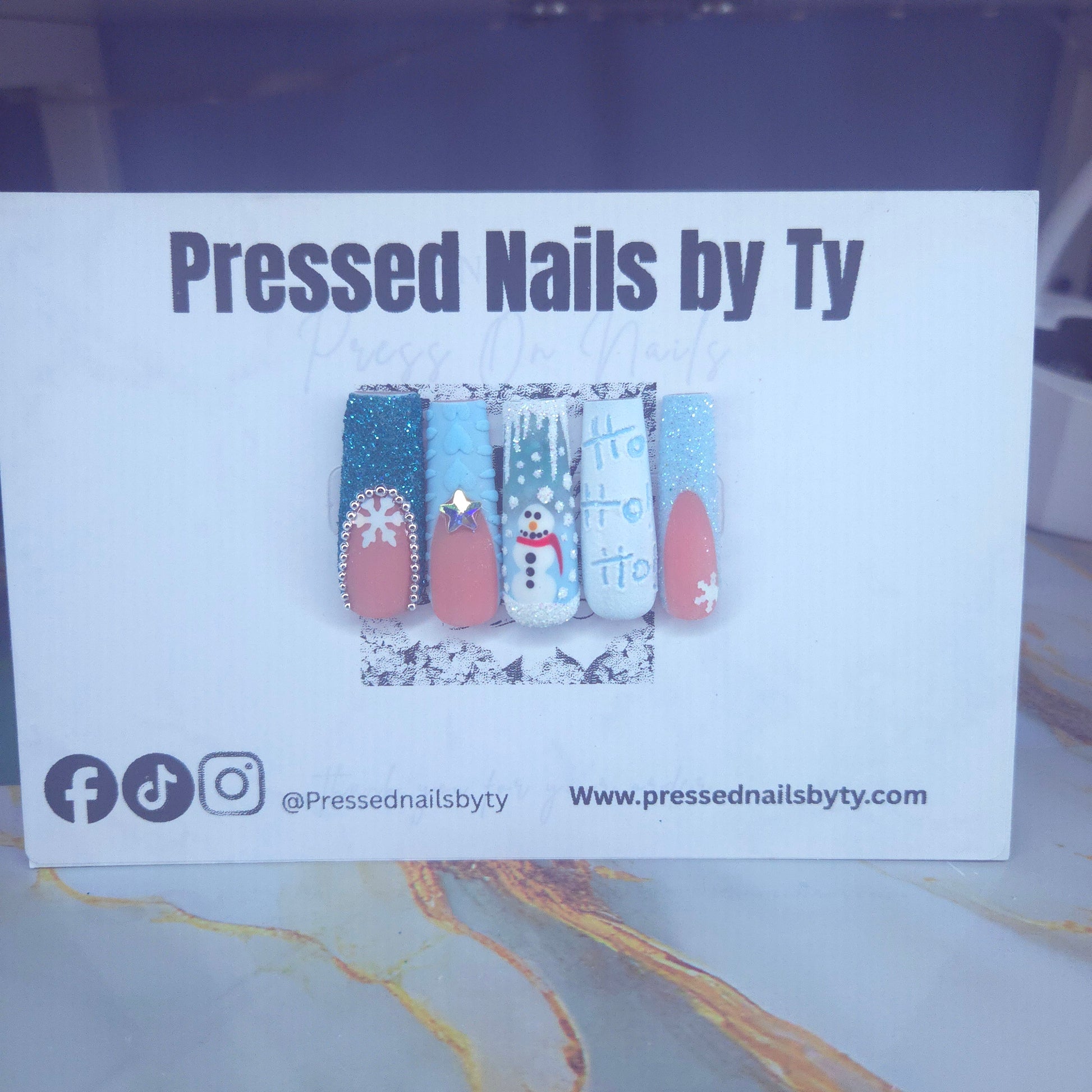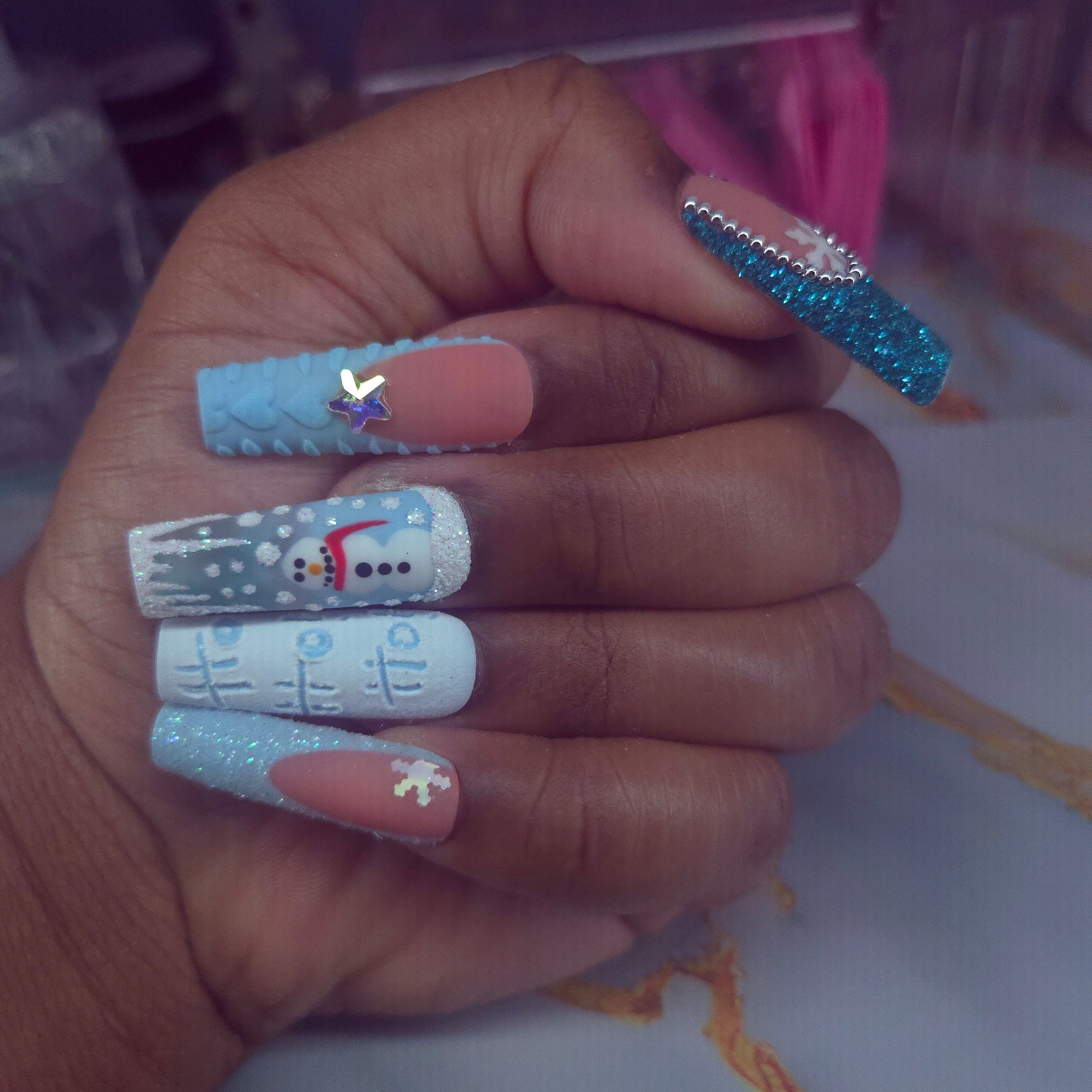 Frosty the Snowman features long nails decorated with snowman icicles, writing in the snow, snowflakes, icy blue hearts, and blue glitter. Expertly crafted with precision and attention to detail, this product is perfect for creating a winter wonderland look. Embrace the magic of the season with Frosty the Snowman.