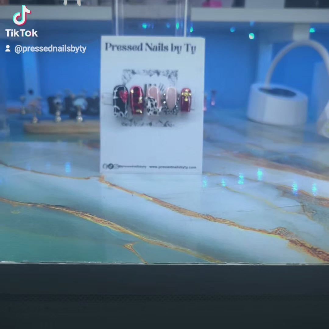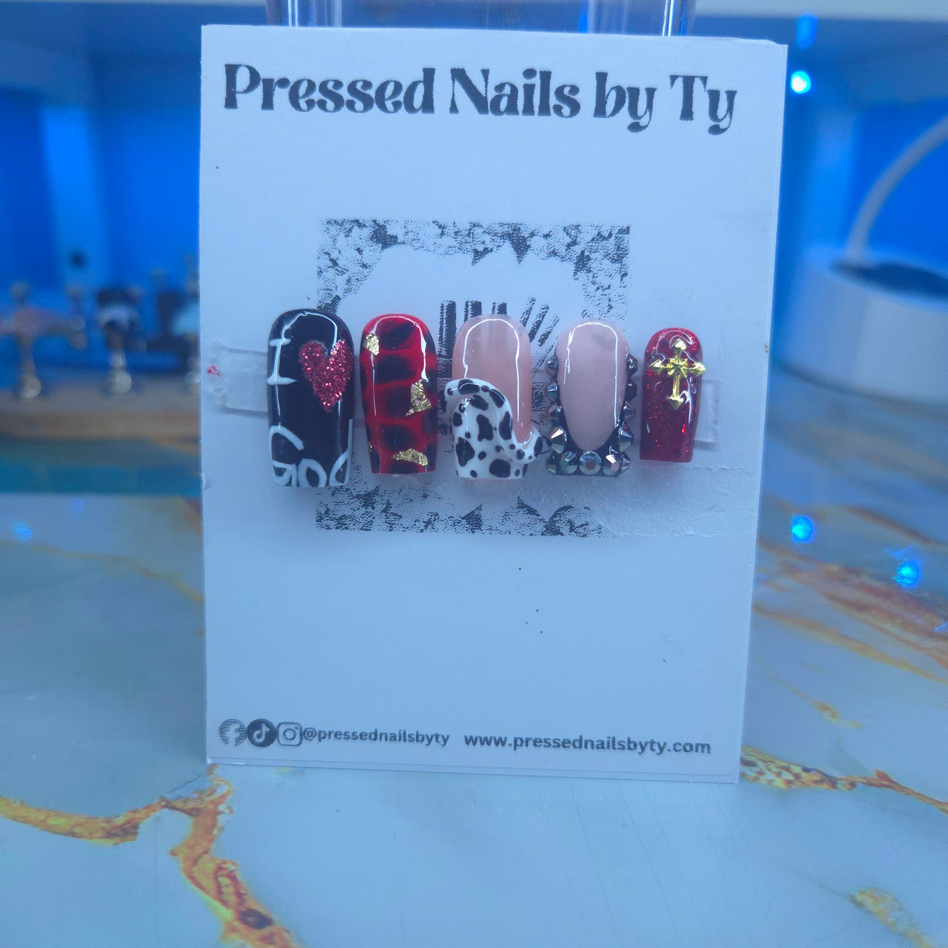 Experience divine style with our "I love God" nail design. Featuring a unique combination of cow print, crocodile print with gold flakes, French black rhinestones, and glitter red nails accented with a gold cross on short length nails. Make a statement of faith with these stunning nails.