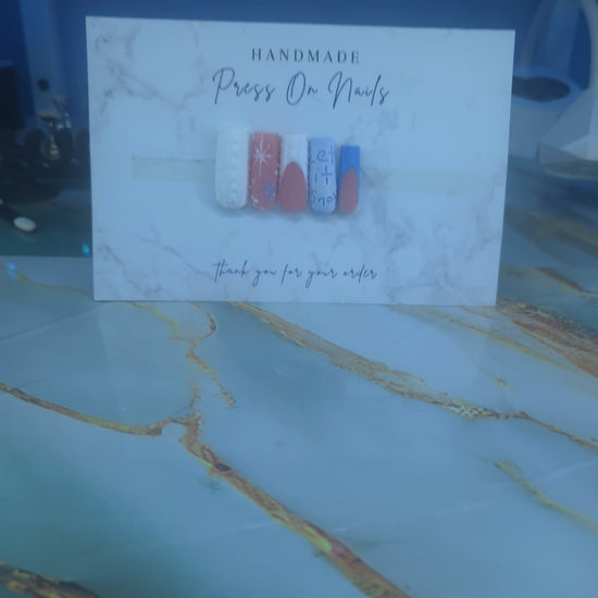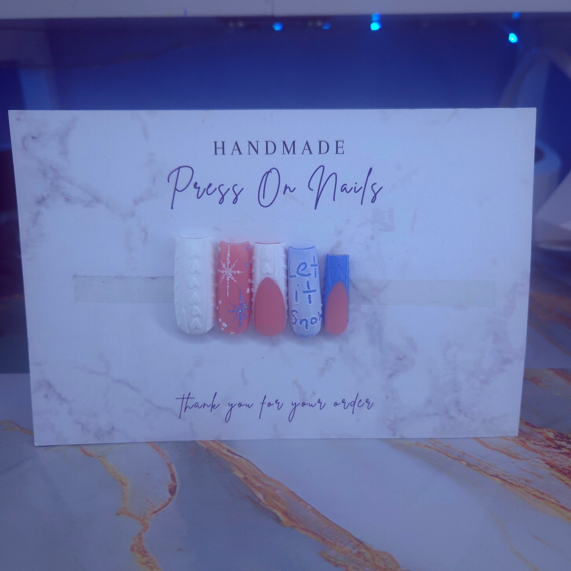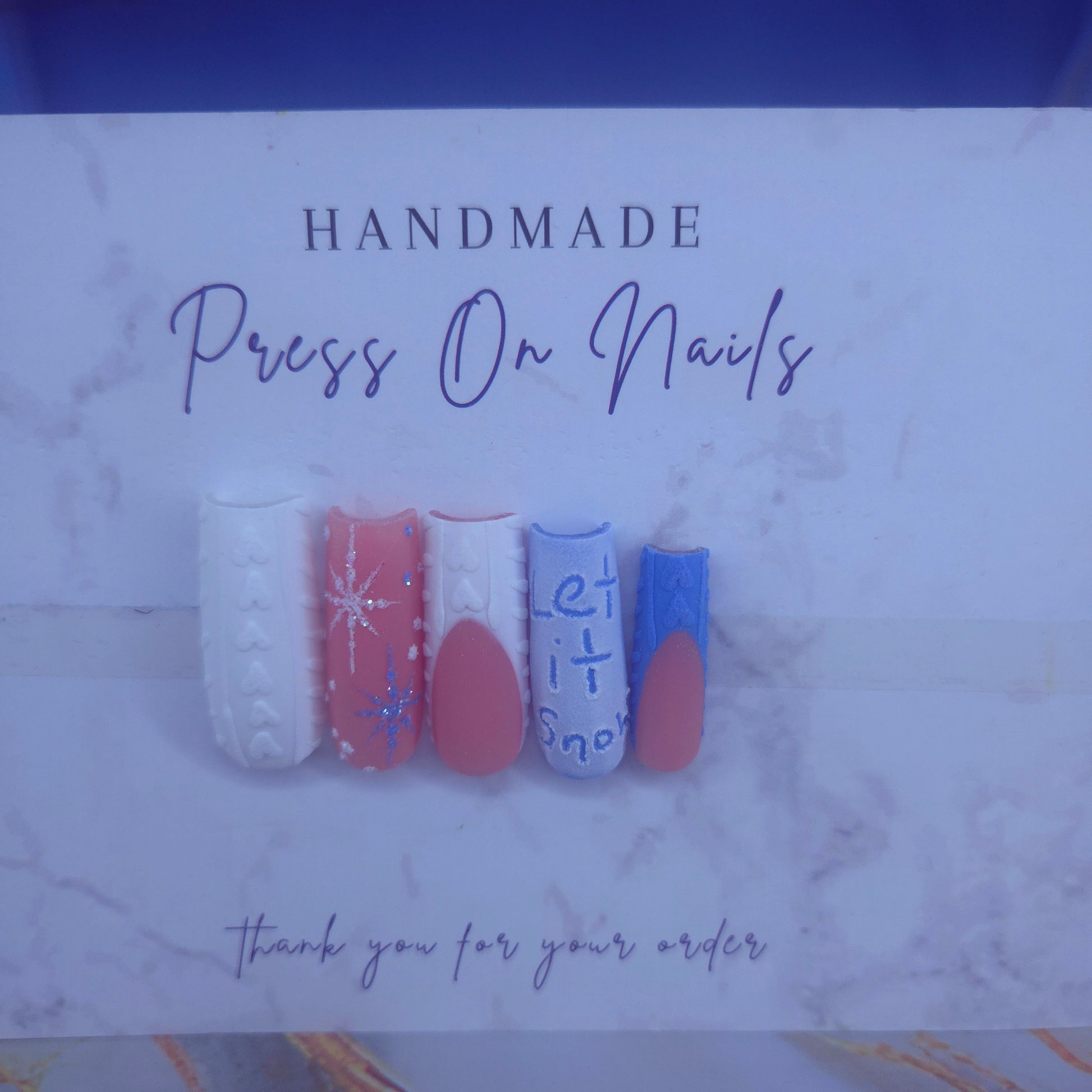 Transform your nails with Let it Snow medium nails in white and light blue. These beautiful French tips feature a snowflake heart sweater design, perfect for the holiday season. Embrace the joy of winter with this stunning nail set.