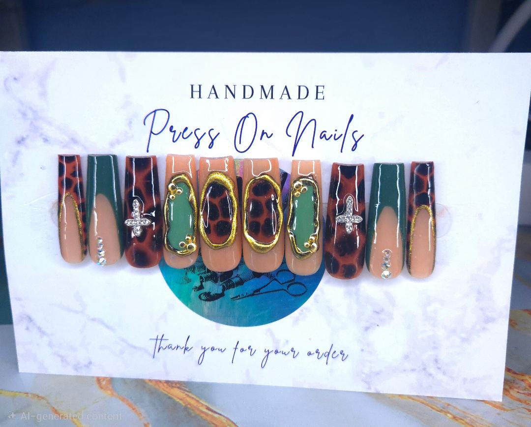 Military Tortoise XXL press-on nails feature a striking tortoise shell design in military green with gold chrome accents and a bold cross motif. These statement nails combine edgy aesthetics with premium craftsmanship, delivering a sophisticated look that commands attention. Perfect for those seeking distinctive nail art that blends natural patterns with contemporary design elements.