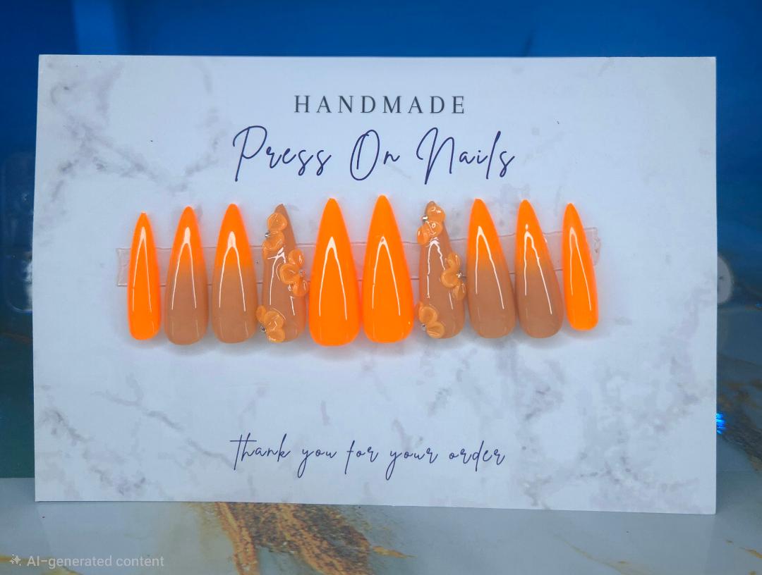 Elevate your nail aesthetic with these striking orange flower neon stiletto ombre press-ons. Featuring a seamless gradient that transitions from vibrant neon orange to softer floral tones, each nail showcases intricate flower detailing for a sophisticated yet bold look. The elongated stiletto shape commands attention while the ombre effect adds dimensional depth. Perfect for those seeking a statement manicure that balances artistic design with modern edge. Easy application and reusable for multiple occasions. All nails are made to order. Please allow 2 weeks to receive your order.
