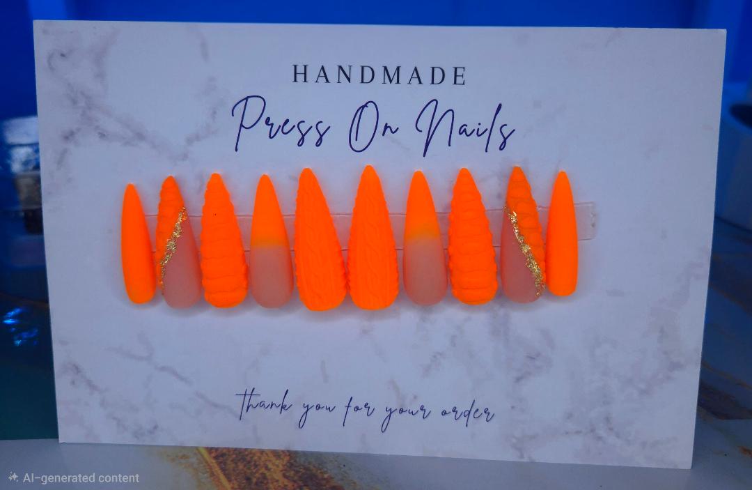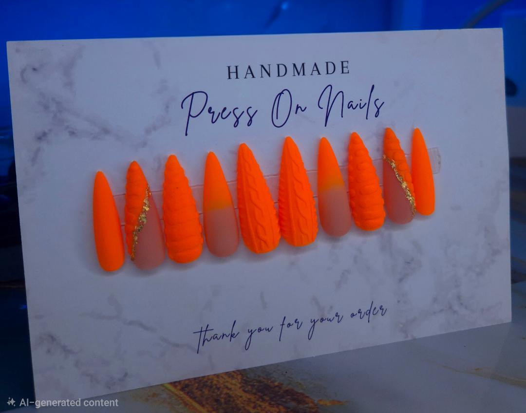 Elevate your nail game with these striking stiletto nails featuring a vibrant neon orange crocodile texture accented with luxe gold flakes. The bold design commands attention while the sharp stiletto shape delivers a sophisticated, edgy aesthetic. Perfect for those who refuse to blend in, these press-ons offer salon-quality results with instant impact. Each set combines eye-catching color with refined detailing for a look that's both daring and polished. All nails are made to order. Please allow 2 weeks to receive your order.