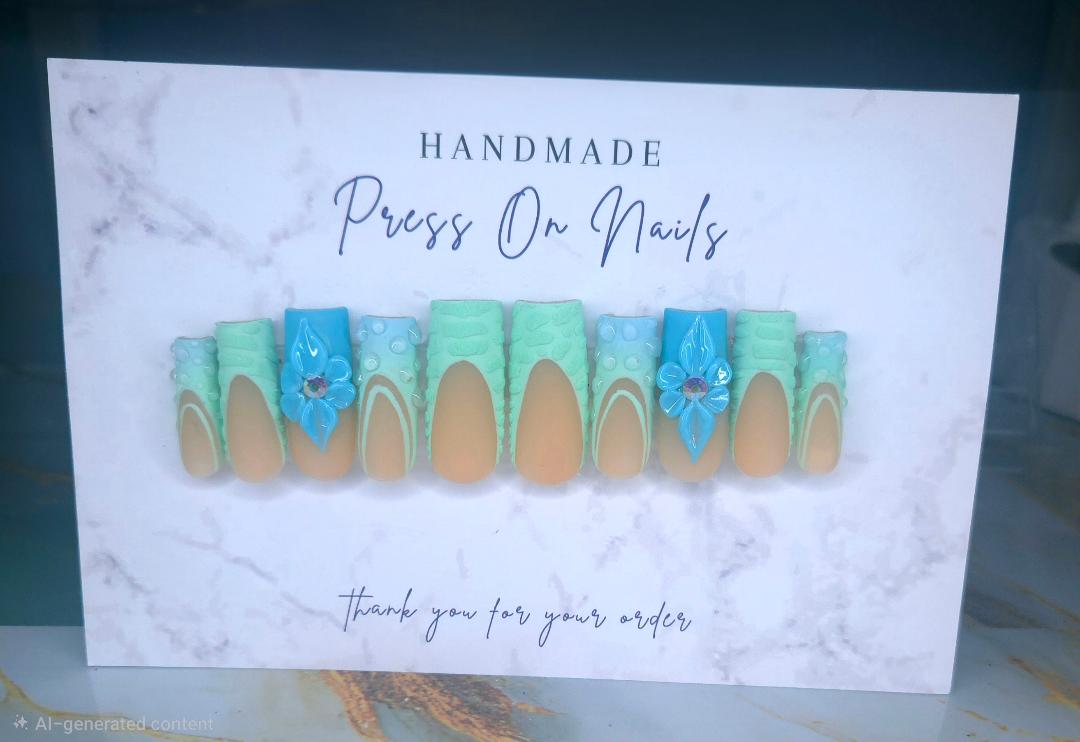 Elevate your nail game with Raindrops, a sophisticated blend of green and blue French tips that captures the essence of nature's most serene moments. These elongated nails feature delicate blue floral accents that dance across the tips, creating a harmonious gradient from cool emerald to ocean blue. Perfect for those seeking a refined, artistic look that transitions seamlessly from everyday elegance to special occasions. The extended length provides a graceful silhouette while the botanical-inspired design adds depth and visual interest. A timeless choice for nail enthusiasts who appreciate subtle complexity and chromatic beauty. All nails are made to order. Please allow 2 weeks to receive your order.