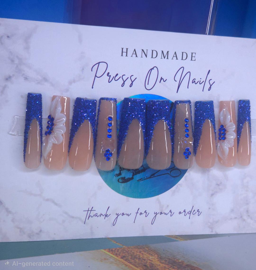 Elevate your nail game with the Royal Star—a stunning fusion of sophistication and glamour. These extra-long press-on nails feature elegant French tips adorned with royal blue glitter and shimmering rhinestones, complemented by delicate flower and butterfly embellishments. Each nail is meticulously crafted to deliver a high-impact, salon-quality finish that commands attention. Perfect for special occasions or everyday luxury, the Royal Star collection offers versatility with professional-grade application. Experience the confidence that comes with flawless, show-stopping nails that last. All nails are made to order. Please allow 2 weeks to receive your order.