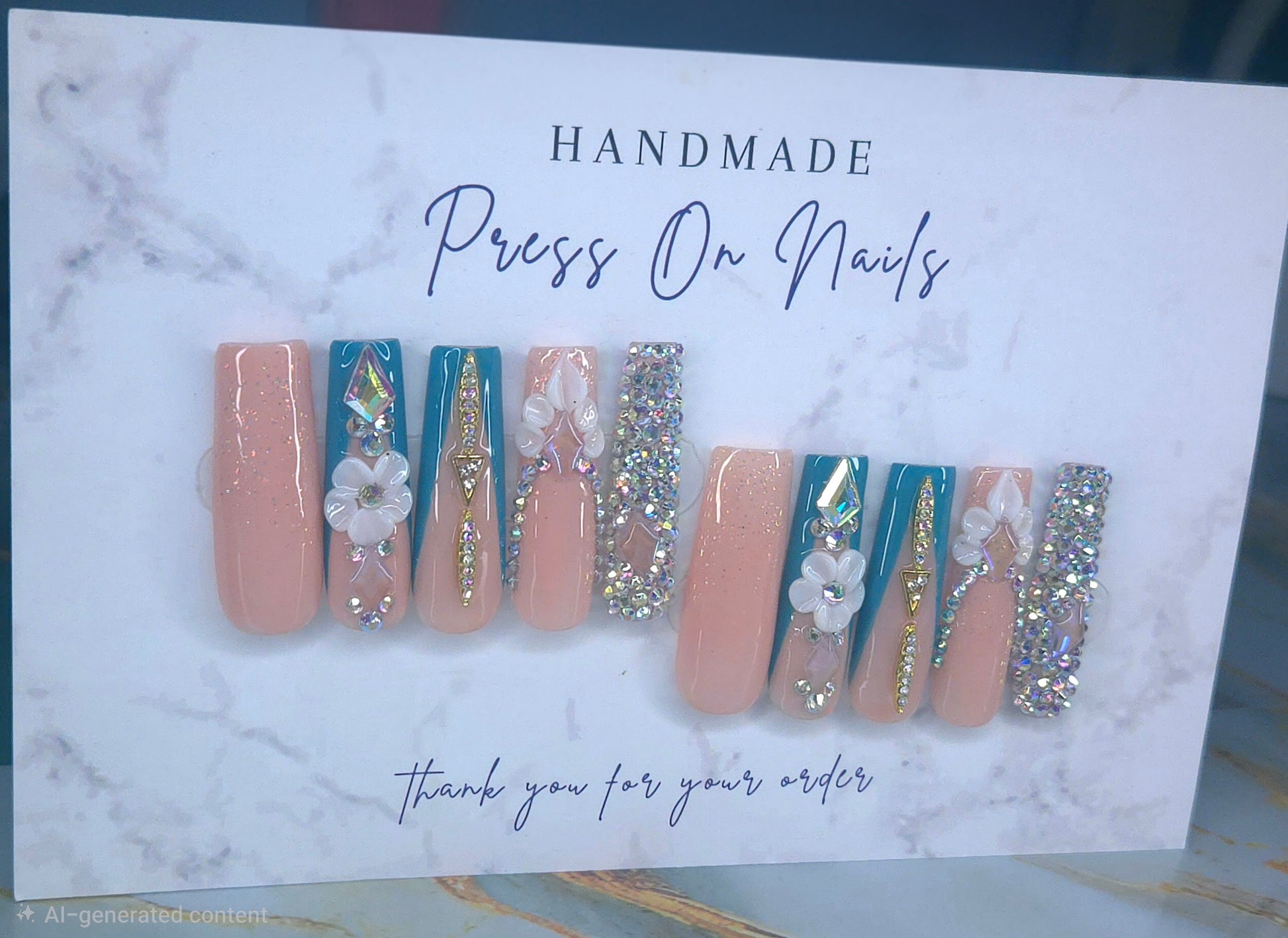 Expertly crafted by hand, these teal blue clear glitter v shaped French tip nails feature a stunning white flower design. With their long length, they'll add a touch of elegance to any look. Perfect for special occasions, these nails are sure to make a statement. All nails are made to order, please allow 2 weeks to receive your order.