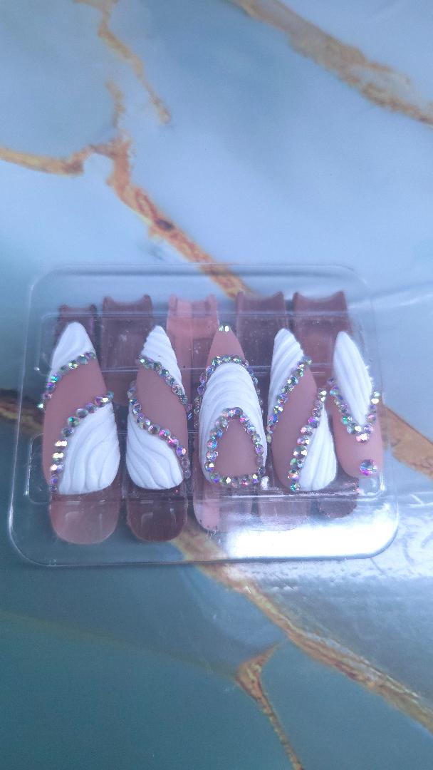 Sugar Cookies press-on nails feature an elegant white rhinestone design set against a pristine base, perfect for those seeking sophisticated nail art without the salon commitment. These stiletto-shaped nails deliver a bold, elongated silhouette that commands attention while the sparkling rhinestone embellishments add refined glamour to any occasion. Pre-sized and ready to apply, they offer a flawless finish in minutes. Ideal for special events or everyday luxury, Sugar Cookies nails combine professional-quality craftsmanship with effortless wearability. All nails are made to order. Please allow 2 weeks to receive your order.