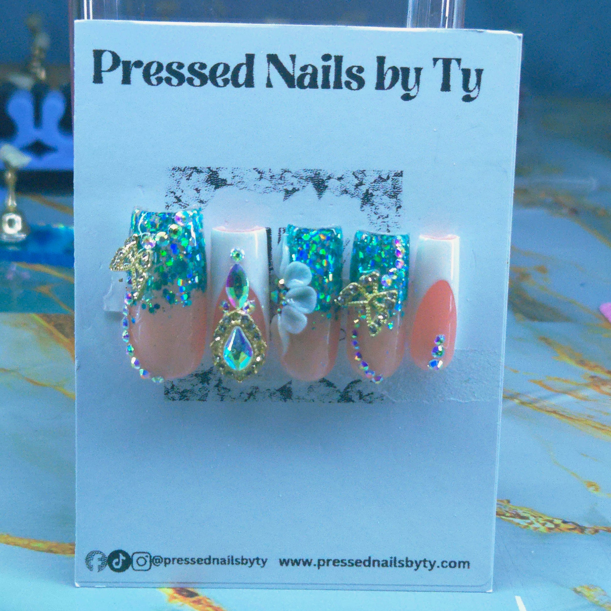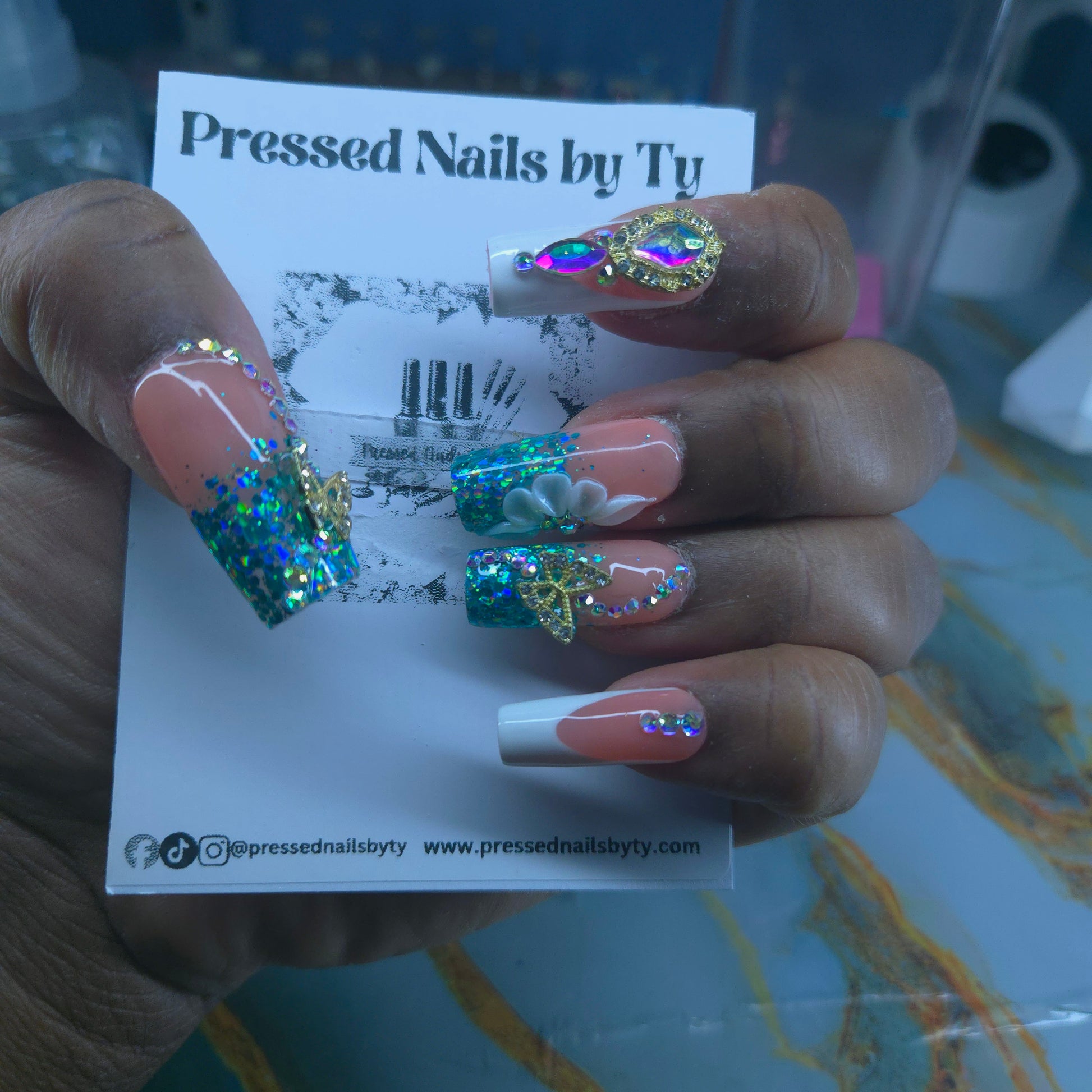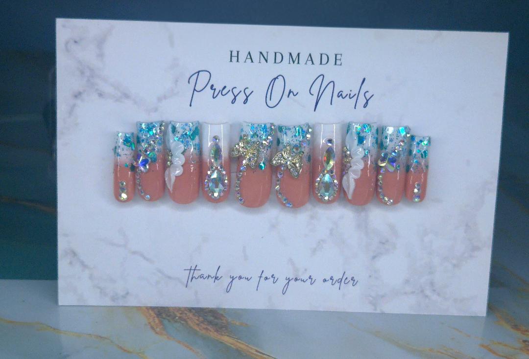 Elevate your nail game with these stunning handcrafted long nails featuring a mesmerizing teal base adorned with sparkling rhinestones. Each set showcases intricate butterfly designs with dimensional details and delicate handmade floral accents that catch the light beautifully. Perfect for making a bold statement, these press-on nails combine artisanal craftsmanship with eye-catching glamour. Whether you're preparing for a special occasion or simply want to express your unique style, these nails deliver professional-quality results with a touch of artistic flair. All nails are made to order. Please allow 2 weeks to receive your order.