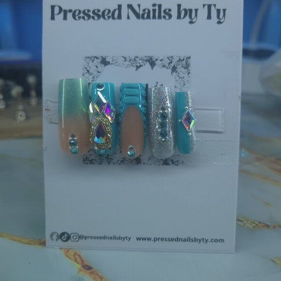 Transform your look with Teal Jewel nails. These medium-long nails feature a stunning French tip adorned with sparkling rhinestones and a 3D crocodile design. Make a statement with this unique and elegant nail set.
