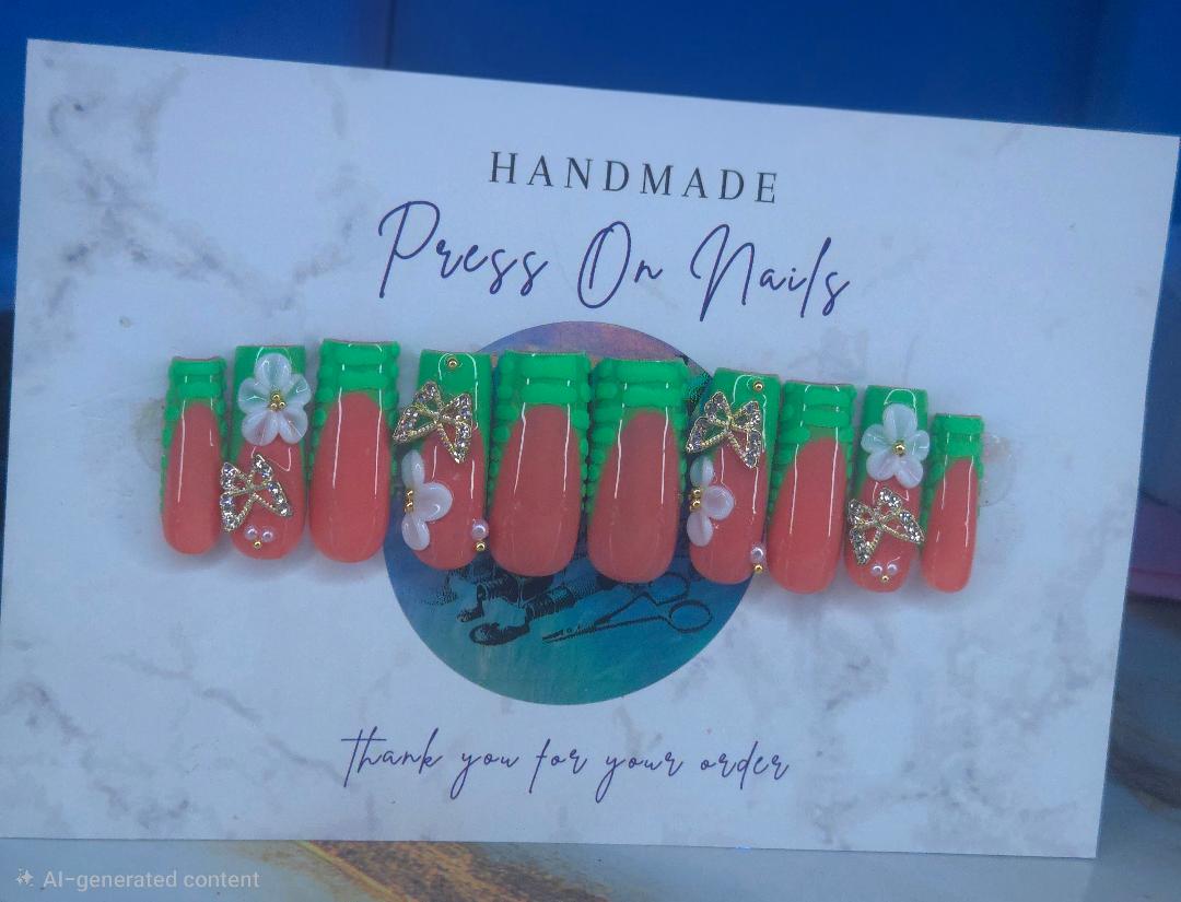 Elevate your nail game with these stunning long press-on nails featuring an intricate watermelon-inspired design. Adorned with delicate butterfly accents and sparkling rhinestone embellishments, each nail showcases a harmonious blend of soft pink and vibrant green hues. The extended length provides a sophisticated silhouette perfect for making a bold statement. Easy to apply and reusable, these nails deliver salon-quality results at home while maintaining durability through daily wear. Ideal for special occasions or everyday glamour. All nails are made to order. Please allow 2 weeks to receive your order.