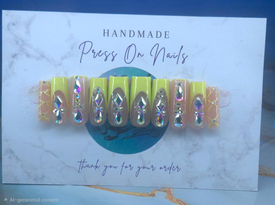 Elevate your nail game with these stunning Yellow Jewel press-on nails, featuring a sophisticated French tip design enhanced with radiant yellow rhinestones. The medium-long ballet shape offers an elegant, elongated silhouette that flatters any hand, while the secure ballet strap design ensures a comfortable, all-day fit. Each nail is meticulously crafted with precision-cut crystals that catch the light beautifully, creating a luxurious sparkle. Perfect for special occasions or everyday glamour, these nails deliver professional-quality results in seconds—no salon appointment needed. All nails are made to order. Please allow 2 weeks to receive your order.